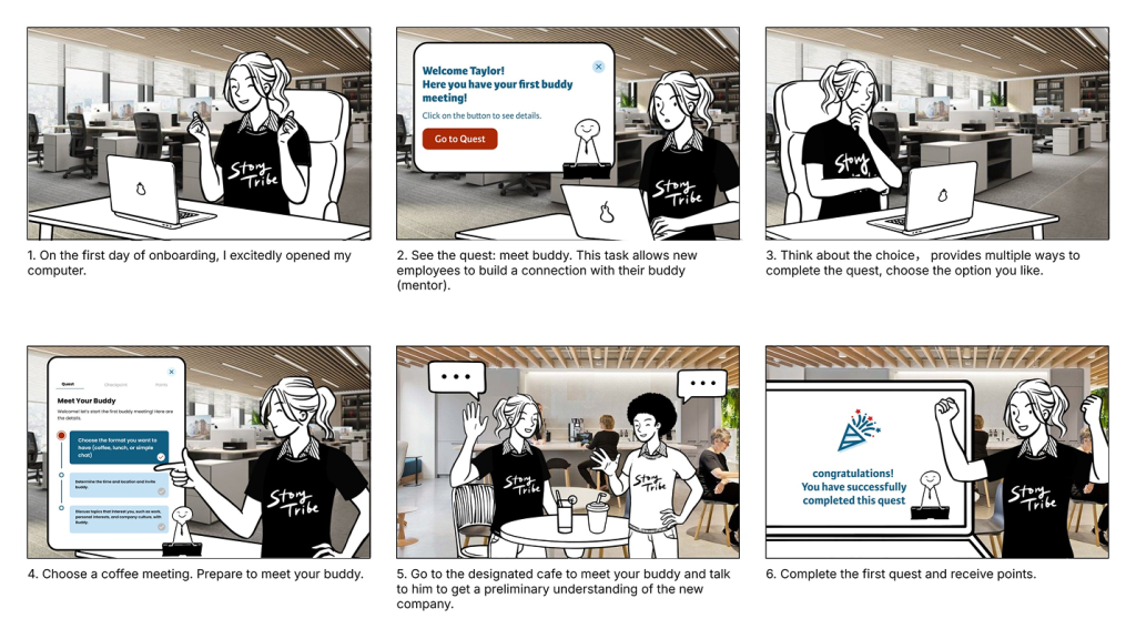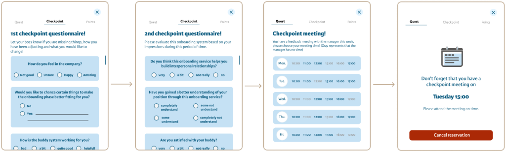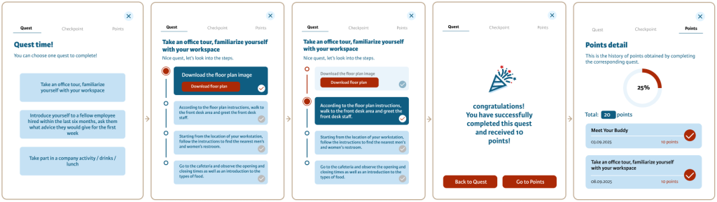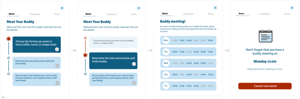 We then developed digital interface mockups including: Buddy matching quiz; Quest selection interface (three options per cycle); Calendar synchronization for meetings; Checkpoint questionnaires shared with managers; Progress bars and reward systems