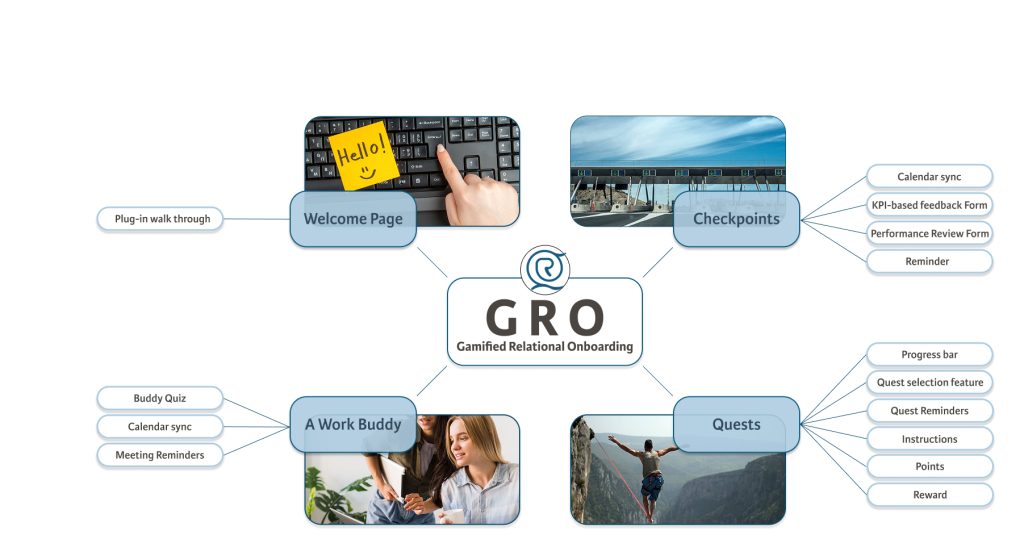GRO (Gamified Relational Onboarding) is a 12-month gamified relational onboarding service that enhances belonging, professional growth, and retention by combining personalized quests, structured buddy support, and reflective checkpoints within existing corporate systems.