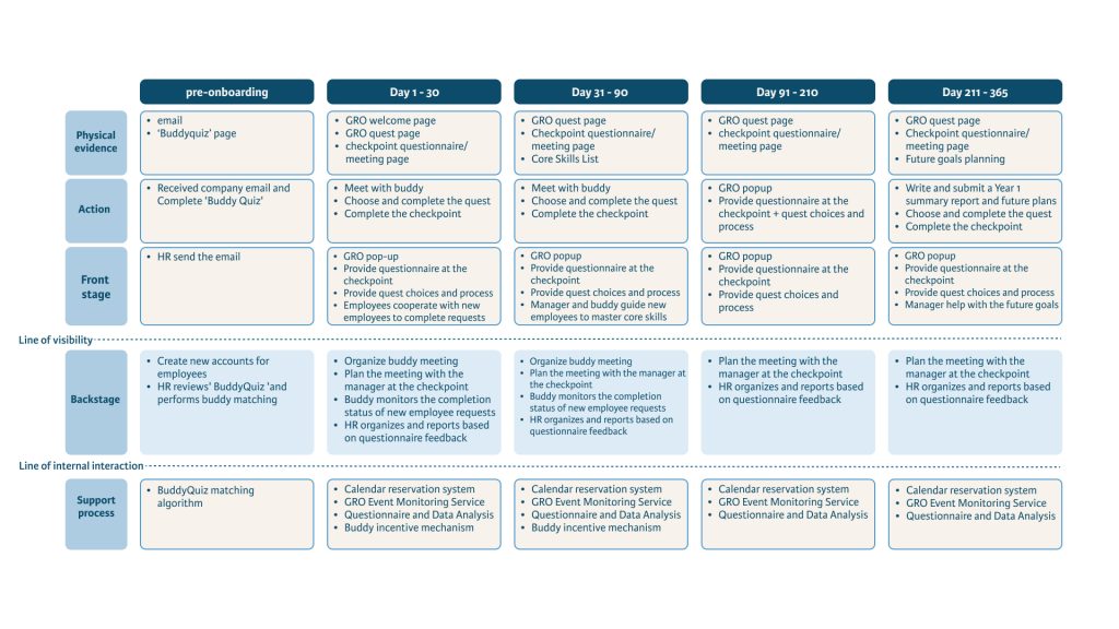 Journey maps and service blueprints were built to test frontstage/backstage interactions across pre-service through post-service phases. These artifacts clarified HR processes, buddy incentives, feedback loops, and data flows.
