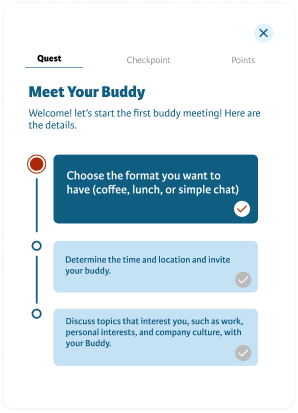 The service includes: Buddy matching algorithm; Phase-based quest system (Start, Learn, Play, Strategize); Recurring checkpoints shared with managers; Calendar integration and automated reminders; Performance-aligned reflection forms; Progress visualization and rewards